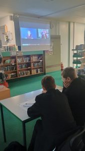 Students then joined a live webinar led by award-winning author Tom Palmer, who interviewed Ruth Barnett, a Holocaust survivor who escaped Germany to England on the Kindertransport in 1939. Students listened with real focus as Ruth spoke about leaving her parents at just four years old, the confusion and fear of her journey, and the crucial support she received from her brother. Many students were visibly moved by her story and commented on how powerful it was to hear first-hand testimony.